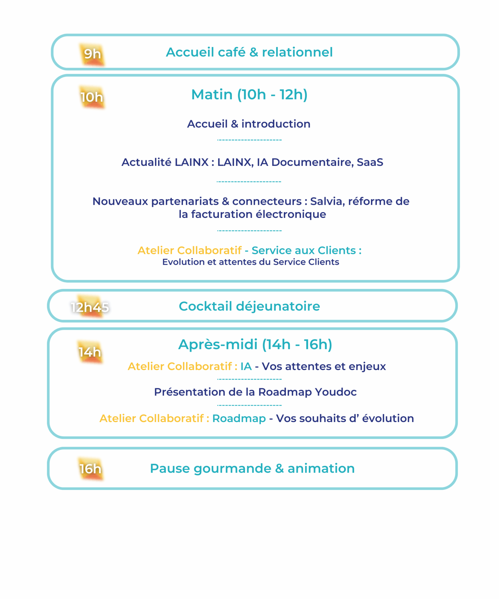 Durant cet événement, divers sujets seront abordés tel que les actualités de LAINX, l’Intelligence Artificielle ou encore les évolutions fonctionnelles de Youdoc. Divers ateliers collaboratifs seront proposés aux participants sur les thématiques de leur choix.